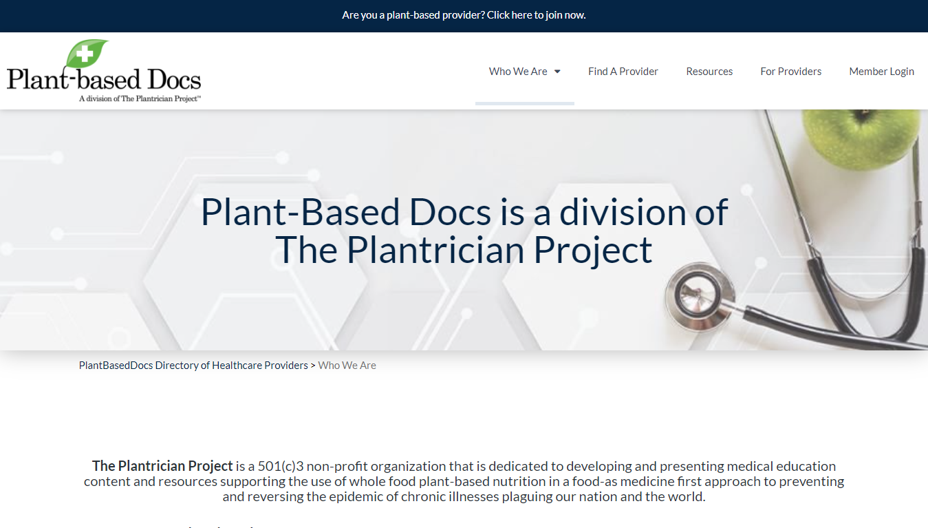 Plant-based Docs is a powerful directory that will connect you with plant-based doctors, nurses, registered dietitians, health coaches and other healthcare professionals committed to using a food-as-medicine-first approach to care.